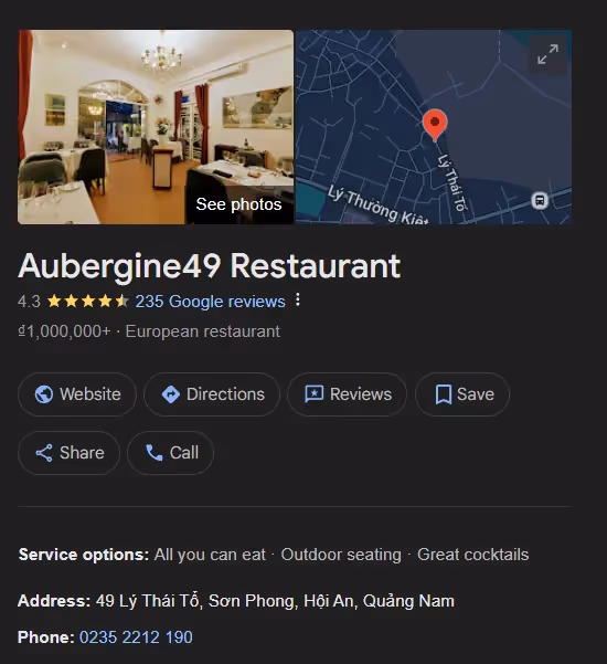 Aubergine49 Restaurant 49A Ly Thai To, Son Phong Ward, Hoi An, Quang Nam Province 175,000 VND – 1,750,000 VND Fine dining with a fusion of European and Asian flavors, led by a Michelin-starred chef