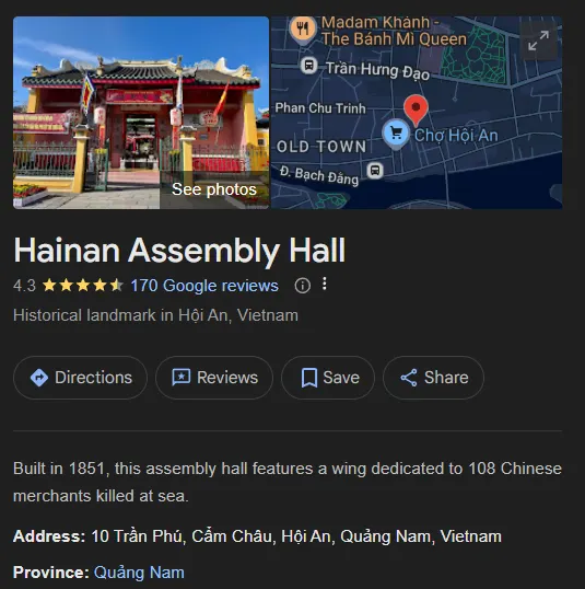 하이난 회관(Hainanese Assembly Hall), 혹은 Quynh Phu 회관으로 알려진 이 장소는 호이안의 문화사에서 특별한 의미를 지니고 있습니다. 1883년, 하이난 섬에서 온 중국 이민자들에 의해 세워진 이 회관은 1851년에 억울하게 해적 누명을 쓰고 처형당한 108명의 하이난 상인들을 기리기 위해 건립되었습니다. 이 비극적인 사건은 베트남의 투득 황제(Tu Duc)에 의해 인정받아, 그들의 결백과 희생을 기념하는 공간으로 회관의 건립이 허락되었습니다.