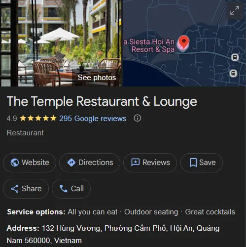 템플 레스토랑은 호이안의 우아함과 고급 다이닝에 중점을 두고 있습니다.화려한 식민지 시대 건물에 자리 잡은 이 레스토랑은 특별한 날에 딱 맞는 아시아 요리와 서양 요리를 제공합니다.