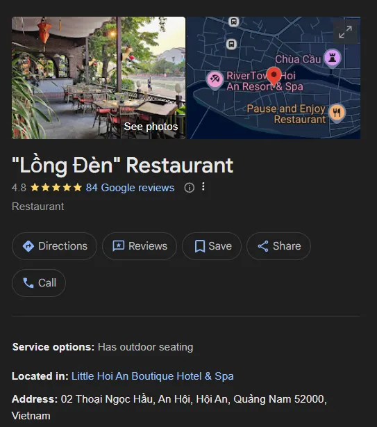 랜턴 레스토랑으로도 알려진 “Lng èn” 레스토랑은 호이안의 매력적인 레스토랑으로 즐거운 식사 경험을 제공합니다.이곳은 전통 등불로 아름답게 장식되어 아늑하고 그림 같은 분위기를 자아냅니다.