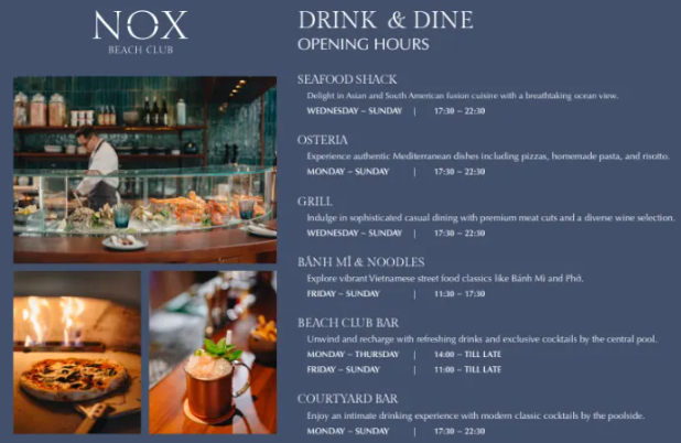 Ngoài ra, NOX Beach Club sở hữu nhiều nhà hàng với phong cách và hương vị độc đáo, đáp ứng nhu cầu ẩm thực đa dạng của du khách bao gồm: